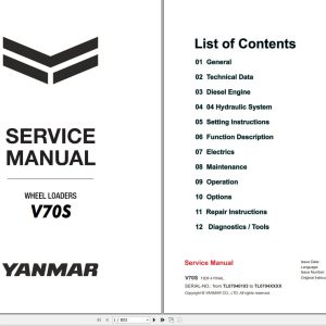 Size: 92.2 MBFormat: PDFLanguage: EnglishBrand: YanmarType of Machine: Wheel LoaderType of Manual: Service Manual, Electrical & Hydraulic DiagramsModel: Yanmar V70S Wheel LoaderSERIAL-NO.: from TL07040103 to TL0704XXXXPart Number: MM554ENWL00201Publication Date: 2019Number of Pages: 803 PagesREALEASE :